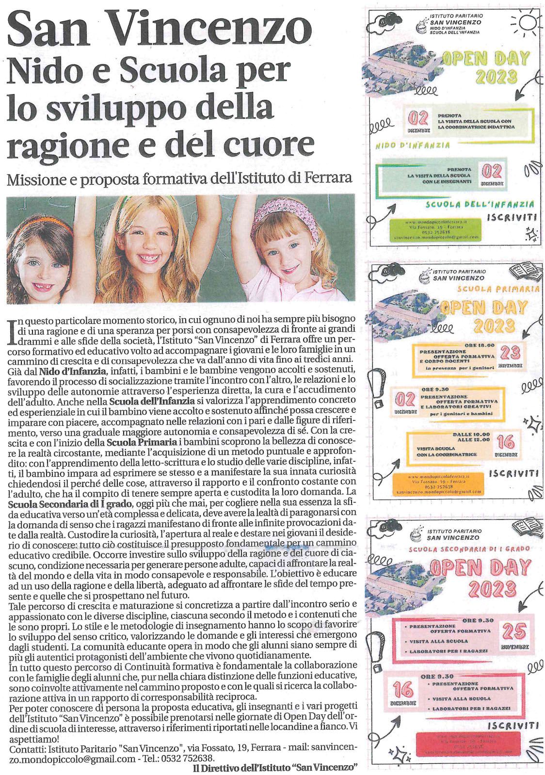 Venerdì 17 Novembre 2023 sulla testata "La Voce di Ferrara Comacchio" è stato pubblicato l'articolo "San Vincenzo - Nido e Scuola per lo sviluppo della ragione e del cuore - Missione e proposta formativa dell'Istituto di Ferrara" nel quale l'Istituto SAN VINCENZO illustra la propria offerta formativa.