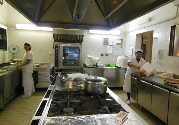 E’ presente, infine, un ampio refettorio rinnovato nell’estate 2017 e una cucina interna della scuola, dove vengono direttamente preparati i pasti.
